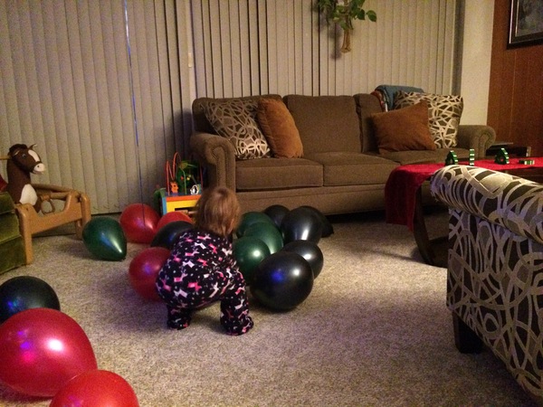 We rented an inflatable Thomas the Tank Engine play tunnel thing. We also got a whole bunch of light, plastic balls for throwing and blew up a ton of balloons. Unbeknownst to me, I evidently bought some high quality balloons, that lost very little air from day to day. This will become relevant later.